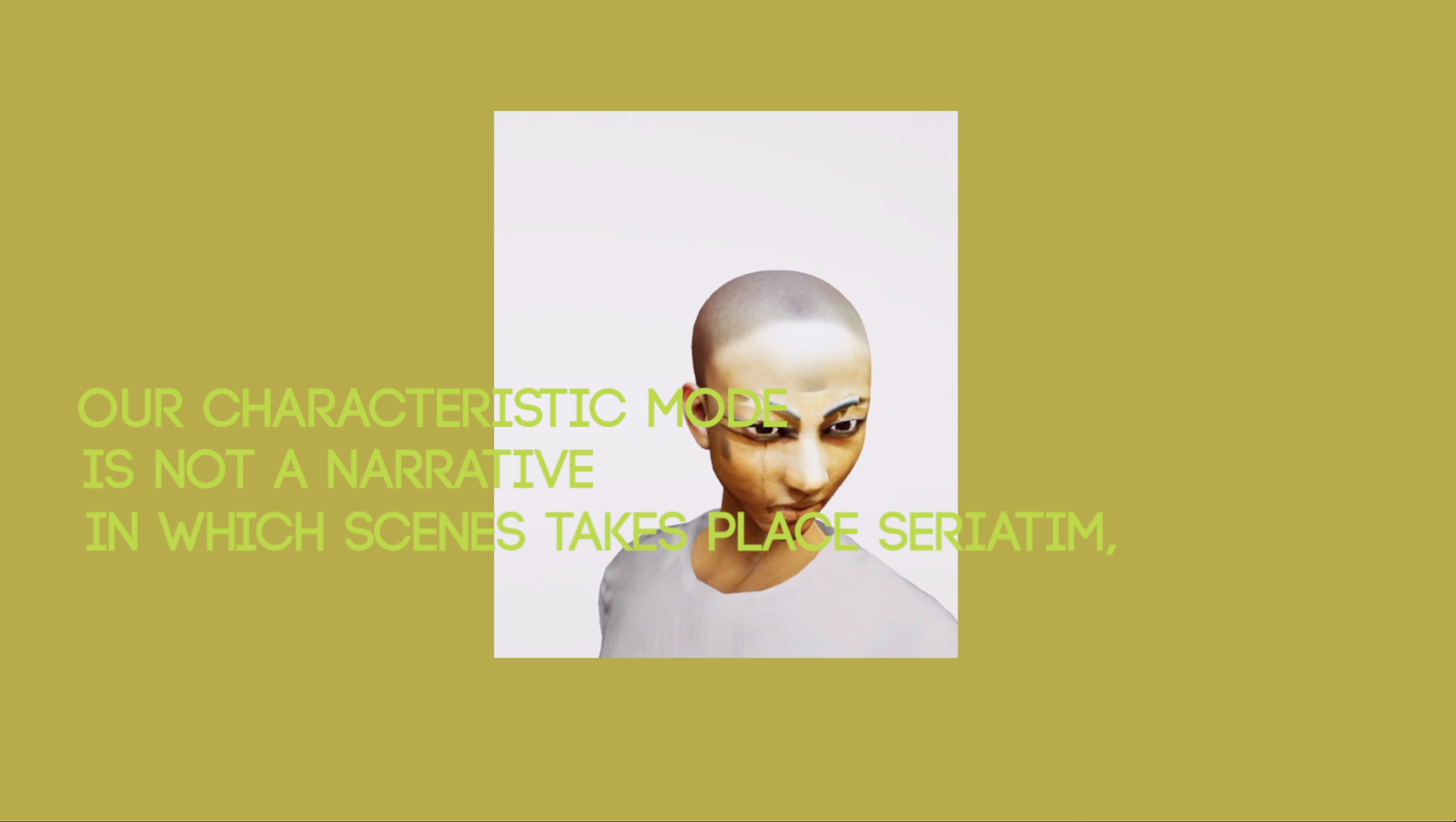 Still from ‘At Those Terrifying Frontiers Where The Existence And Disappearance Of People Fade Into Each Other’ (2019). Courtesy of Basel Abbas and Ruanne Abou-Rahme - (IMAGE DESCRIPTION: A digital figure with a shaved head looks downward, centered against a white rectangle over a yellow landscape, with the light yellow text “OUR CHARACTERISTIC MODE IS NOT A NARRATIVE IN WHICH SCENES TAKES PLACE SERIATIM,” across the image).At Those Terrifying Frontiers Where The Existence And Disappearance Of People Fade Into Each Other